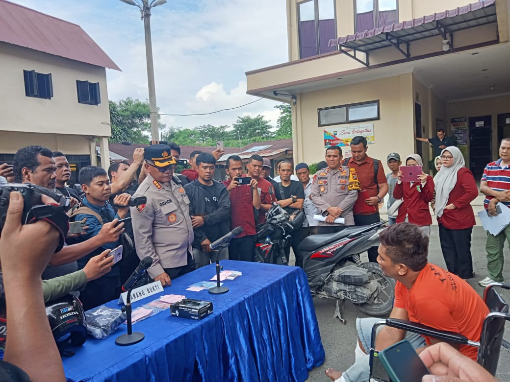 Kapolrestabes Medan, Kombes Pol Gidion Arif Setyawan, didampingi Kapolsek Sunggal, Bambang G Gutabarat, saat menggelar kasus pencurian dengan kekerasan di Polsek Sunggal Jalan TB. Simatupang Medan, Selasa (21/01/2025).