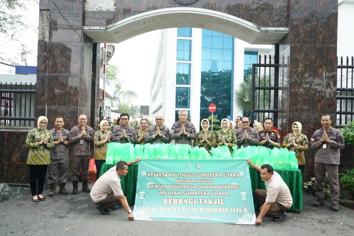 MEDAN | MEDIA 24 JAM.COM-Kejaksaan Tinggi Sumatera Utara dan Ikatan Adhyaksa Dharmakarini (IAD) Wilayah Sumut gelar bakti sosial Ramadan 1446 H, Kamis (20/3/2025) bagi-bagikan takjil (makanan untuk berbuka puasa) kepada warga masyarakat pengguna jalan di depan kantor Kejati Sumut Jalan AH Nasution Medan.