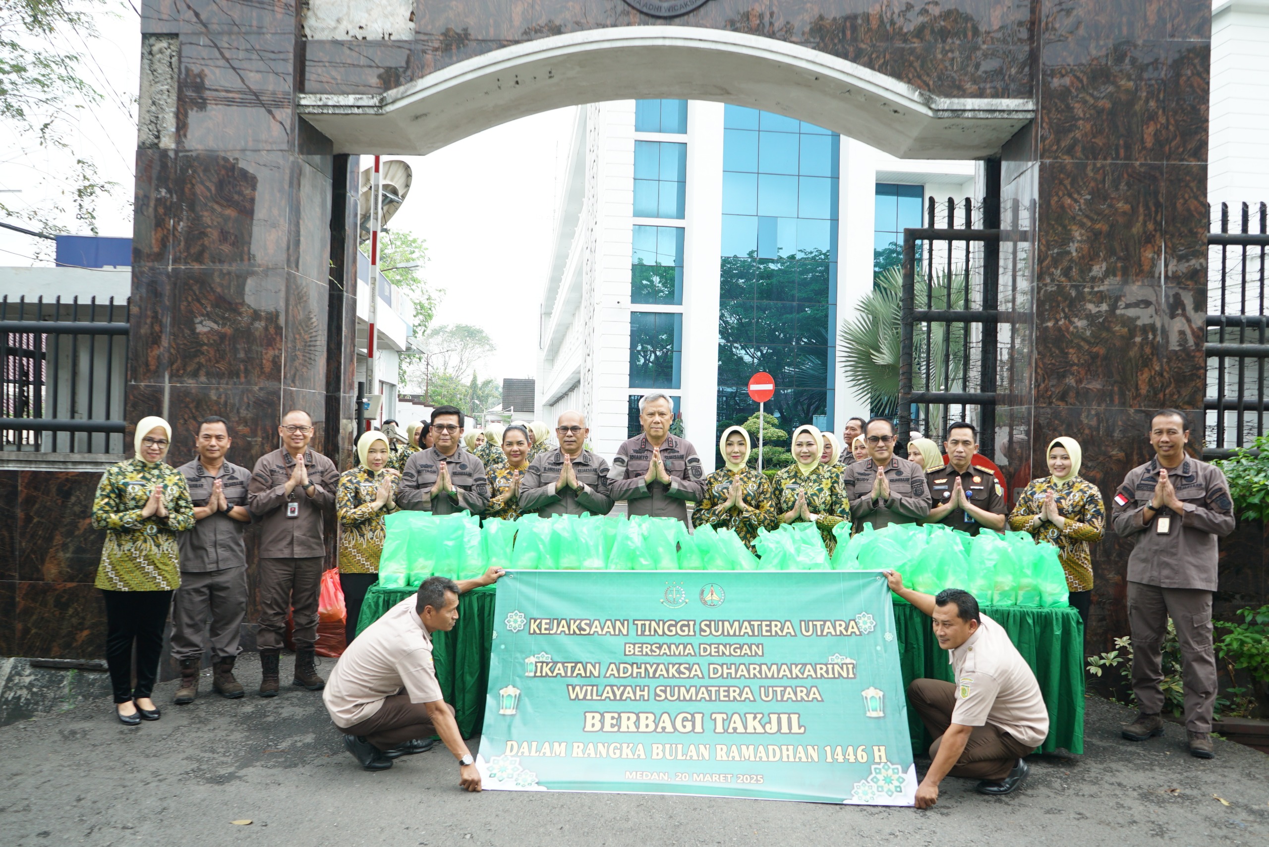 Pembagian takjil diikuti Kajati Sumut Idianto, SH,MH, Wakajati Sumut Rudy Irmawan, SH,MH, para Asisten, Koordinator, Kabag TU, Ketua IAD Wilayah Sumut Ny. Asti Idianto, serta pengurus IAD Wilayah Sumut lainnya.