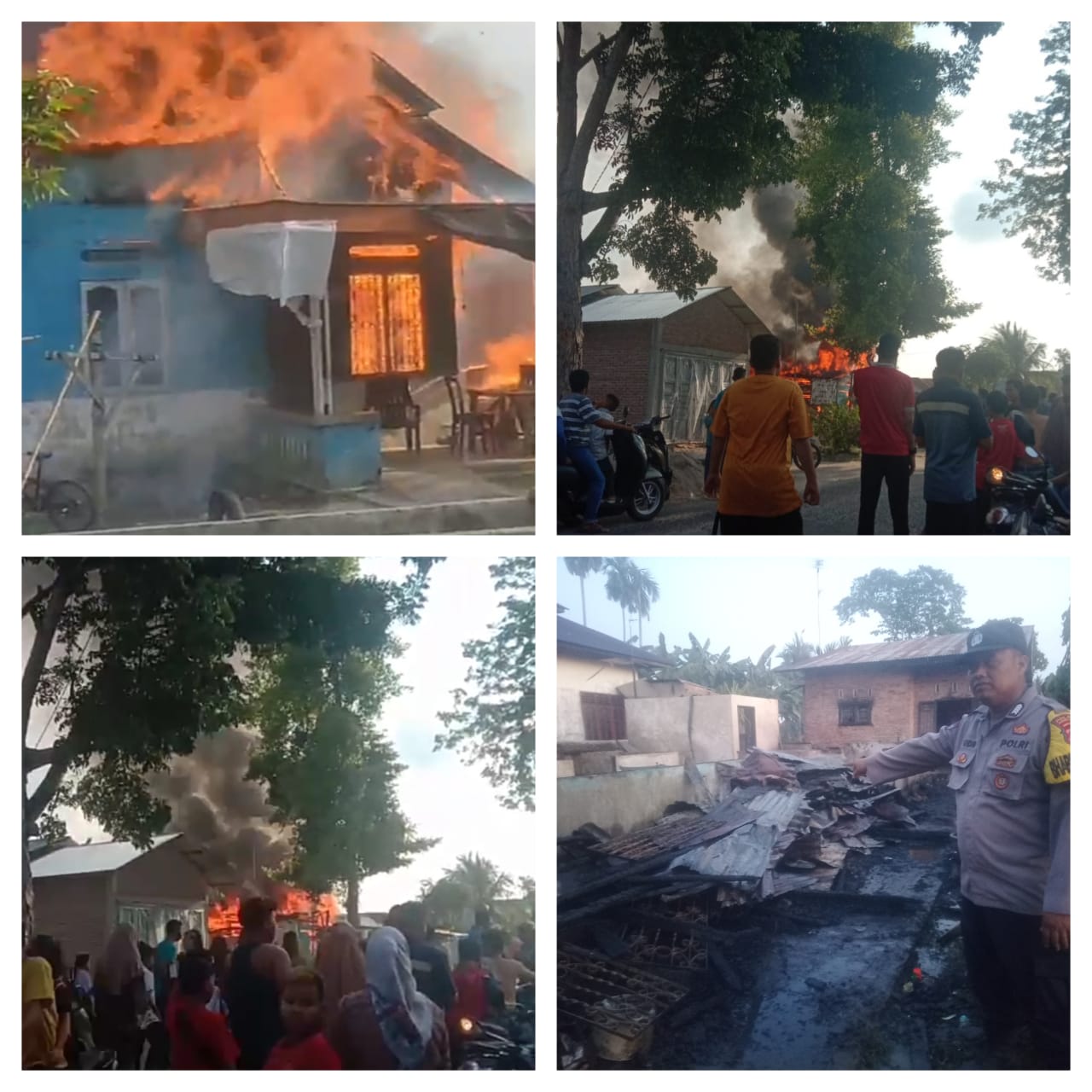 Tetapi, api semakin membesar yang dimana pada saat kejadian cuaca sangat panas, dan mereka pun menjerit minta tolong kepada warga sekitar lantaran tidak mampu memadamkan api, katanya. Tidak butuh waktu lama kurang lebih satu jam, api menghanguskan seluruh bangunan rumah semi permanen tersebut, kata Khairul Umam bersama keempat temannya.