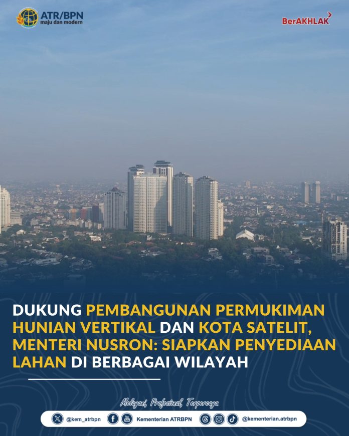 Jakarta, Media24jam – Kementerian Agraria dan Tata Ruang/Badan Pertanahan Nasional (ATR/BPN) memperkuat dukungan terhadap Program Strategis Nasional (PSN) melalui Pembangunan Permukiman Hunian Vertikal dan Kota Satelit. Menteri ATR/Kepala BPN, Nusron Wahid, mengatakan bahwa dukungan diberikan dengan penyediaan lahan skala besar di berbagai wilayah Indonesia.