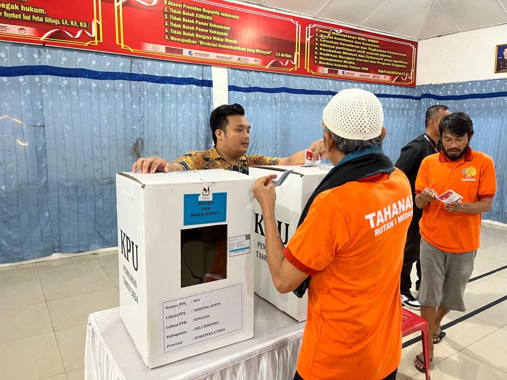 Medan-Meskipun berada di dalam Rutan, dan dalam kondisi hujan dan banjir 2465 warga binaan Rumah Tahanan Negara (Rutan) Kelas I Medan Kanwil Kemenkumham Sumut tetap menunjukkan antusiasmenya dalam menggunakan hak pilih di Pemilihan Kepala Daerah (Pilkada) 2024 pada Rabu (27/11). Hal ini terlihat dari partisipasi aktif mereka dalam mengikuti proses pemungutan suara di TPS khusus 901, 902, 903, 904 dan 905 Rutan Medan yang bertempat di Aula Sahardjo dan lapangan Rutan.