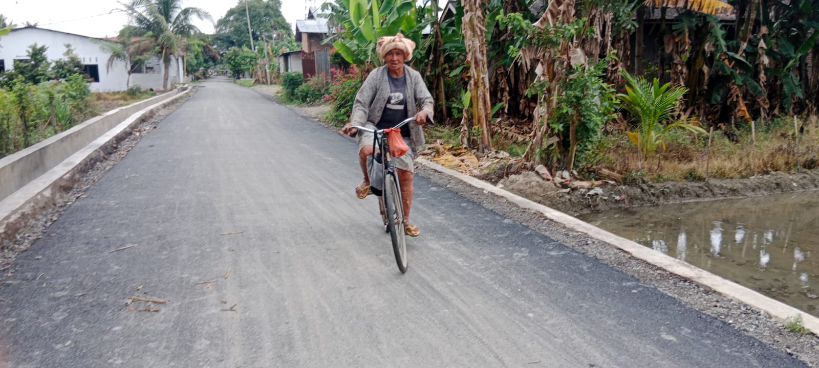 “Sebelum dibangun, jalan ini rusak berlubang. Kalau melintas seperti naik kuda, bila hujan jalan digenangi air sehingga sangat membahayakan,” ujarnya.
