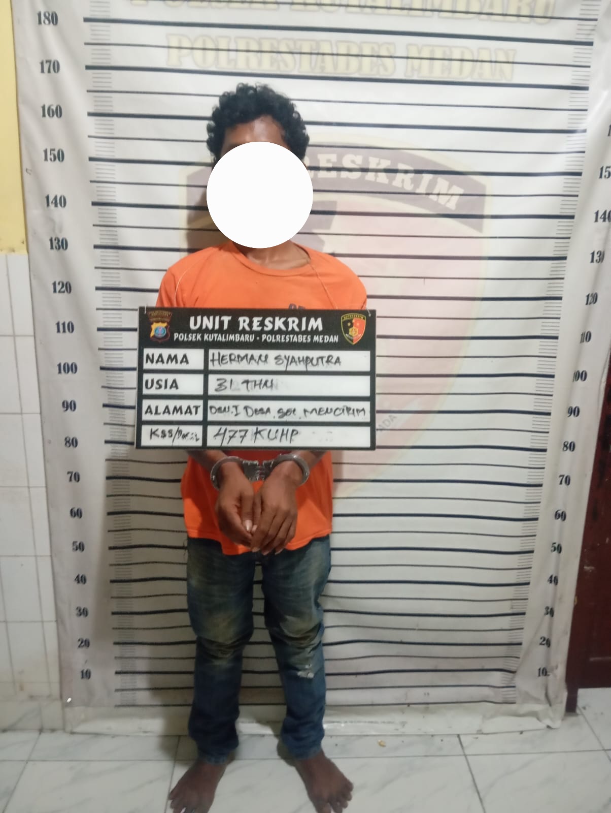 Pelaku ditangkap pada Minggu (26/4/2026) sekira pukul 20.00 WIB di kawasan Dusun I Desa Sei Mencirim, setelah polisi menerima informasi keberadaannya. Tanpa perlawanan, tersangka langsung digelandang ke Mapolsek Kutalimbaru.