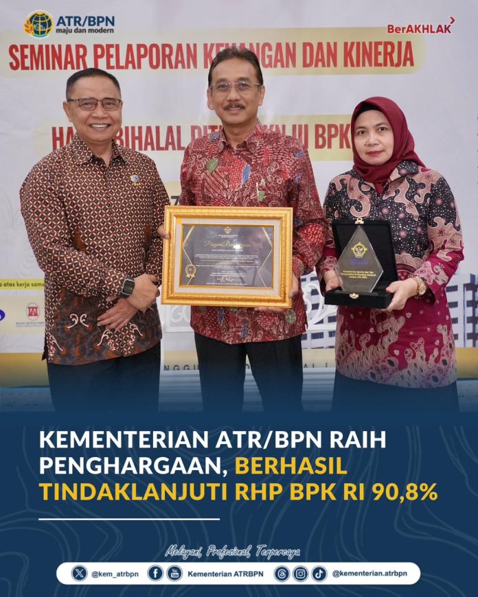 Jakarta, Media24jam – Kementerian Agraria dan Tata Ruang/Badan Pertanahan Nasional (ATR/BPN) melaksanakan Tindak Lanjut Rekomendasi Hasil Pemeriksaan (TLRHP) dari Badan Pemeriksa Keuangan (BPK). Dari hasil tersebut, Kementerian ATR/BPN telah menyelesaikan 90,8% temuan yang berbuah apresiasi berupa penghargaan dari BPK.