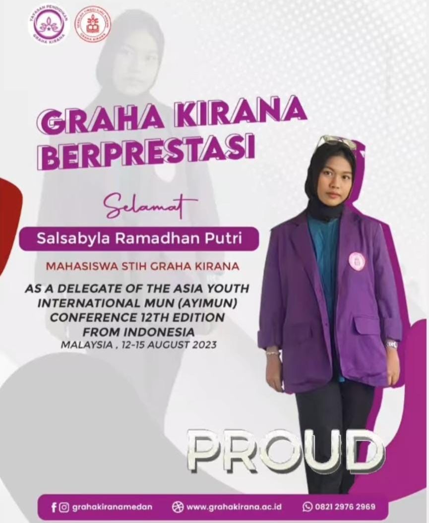 MEDIA24JAM.COM- Mahasiswi Sekolah Tinggi Ilmu Hukum (STIH) Graha Kirana Semester III, Salsabyla Ramadhan Putri Harahap berhasil terpilih menjadi salah satu perwakilan delegasi Indonesia dalam acara Asia Youth International Model United Nation (AYIMUN) tahun 2023 di Kuala Lumpur, Malaysia pada tanggal 12-15 Agustus 2023.