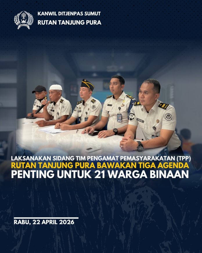 Tanjung Pura, Media24jam – Rumah Tahanan Negara (Rutan) Kelas IIB Tanjung Pura melaksanakan Sidang Tim Pengamat Pemasyarakatan (TPP) di Aula Rutan, Rabu (22/04), dengan membahas tiga agenda penting yang melibatkan 21 warga binaan.
