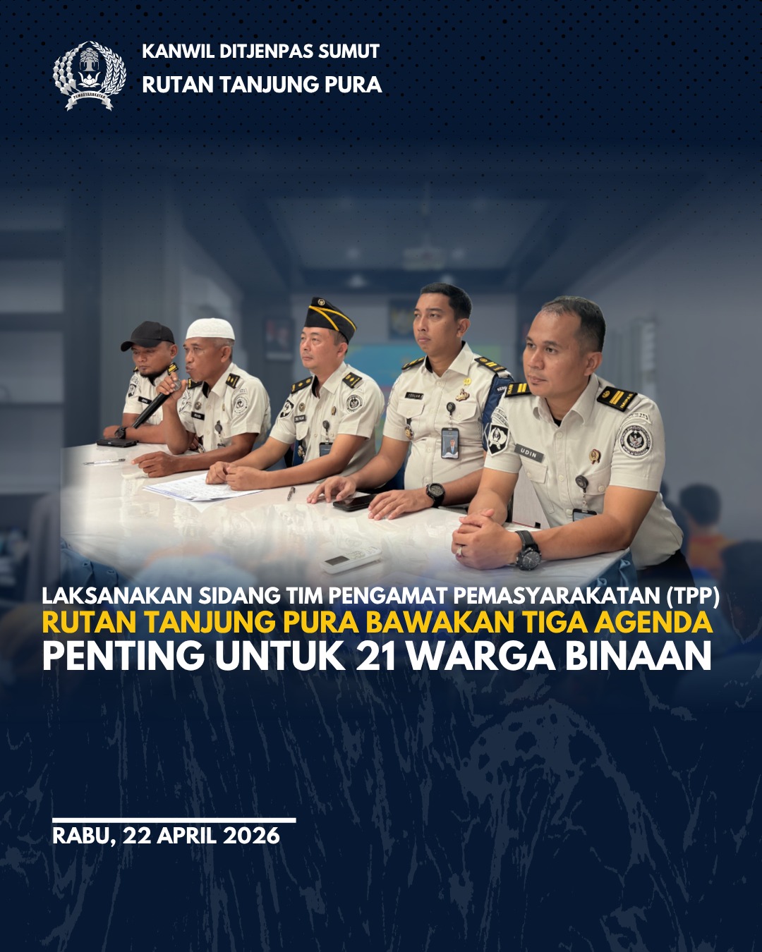 Ketiga agenda tersebut meliputi pengusulan program integrasi bagi 12 warga binaan, pengangkatan Tahanan Pendamping (Tamping) untuk 8 warga binaan, serta pengusulan mutasi Unit Pelaksana Teknis (UPT) terhadap 1 warga binaan. Kegiatan ini menjadi bagian dari komitmen Rutan Tanjung Pura dalam menjalankan proses pemasyarakatan yang menjunjung prinsip keadilan, transparansi, dan penghormatan terhadap hak warga binaan.