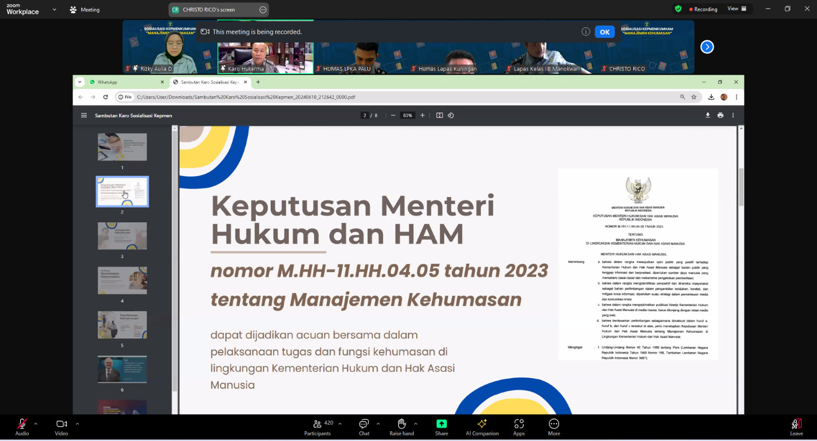 Palu, Media 24 Jam – Terus berupaya meningkatkan Kualitas Sumber Daya Manusia (SDM) yang unggul, Lembaga Pembinaan Khusus Anak (LPKA) Kelas II Palu Kantor Wilayah Kementerian Hukum dan Hak Asasi Manusia Sulawesi Tengah (Kanwil Kemenkumham Sulteng) menghadiri secara virtual kegiatan sosialisasi Keputusan Menteri Hukum dan Hak Asasi Manusia (Kepmenkumham) RI Nomor HH-11.HH.04.05 Tahun 2023 tentang Manajemen Kehumasan, Selasa, (11/6/2024).