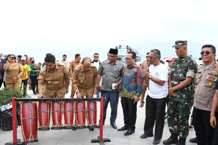 SAMOSIR, MEDIA 24 JAM – Dalam rangka Perayaan Hari Jadi Kabupaten Samosir ke-20, Bupati Samosir Vandiko T. Gultom dan Wabup Martua Sitanggang melakukan pemukulan gendang sebagai tanda pembukaan secara resmi stand pameran UMKM di Komplek Water Front City Pangururan, 26/02.