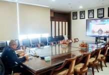 Didampingi istri Ny. Sukartini Wau, Walikota terlihat mengenakan baju PDH saat mengikuti siaran virtual di aula lantai ll kantor Walikota Gunungsitoli, Jalan Pancasila, Desa Mudik, Kecamatan Gunungsitoli.